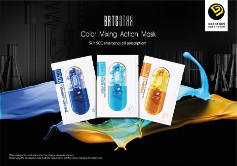 BRTC 컬러 믹싱 액션 마스크는 ‘피부 SOS, 알약으로 긴급 처방!’의 컨셉으로, 사용하기 직전에 캡슐을 터뜨리면 캡슐 안에 들어있던 고농축 유효성분 오일의 컬러가 하단의 마스크팩에센스와 섞이며 컬러가 변하는 믹싱 액션 마스크이다. 소비자는 투명창으로 오일 앰플이 잘 섞였는지 확인할 수 있고, 컬러가 섞이는 모습을 지켜보는 재미가 있는 제품이다. 3종 키트는 일반적인 단상자가 아니라 리플렛 형식으로 구성하여 한눈에 제품을 펼쳐서 볼 수 있고, 진열장에 책처럼 꽂아서 DP하여 소비자의 호기심을 불러일으키도록 디자인되었다.