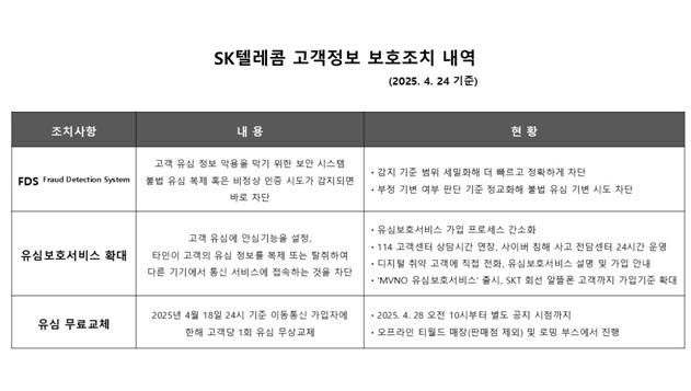 유영상 SKT CEO는 이날 서울 을지로 SK텔레콤 사옥에서 열린 고객 정보 보호조치 강화 설명회에서 "SK텔레콤을 믿고 이용해주신 고객 여러분과 사회에 큰 불편과 심려를 끼쳐 드린 점에 대해 진심으로 사과드린다"며, "SK텔레콤을 이용하는 모든 고객분들을 대상으로 원하실 경우 유심카드를 무료로 교체해드리는 추가 조치를 시행하겠다"고 밝혔다.