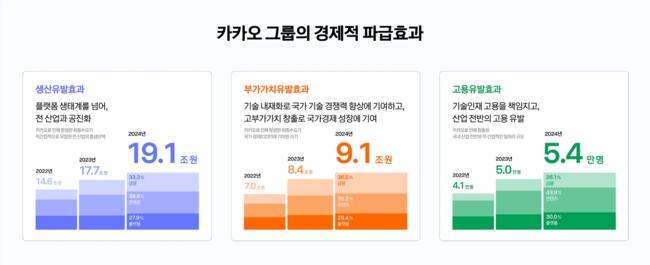 카카오에 따르면, 2024년 카카오 그룹의 경제적 성과는 ▲생산유발효과 19.1조 원 ▲부가가치유발효과 9.1조 원 ▲고용유발효과 5만 4,000명에 달했다. 이는 지난해에 이어 상승세를 이어가고 있는 수치로, 최근 3년간 누적 생산유발효과는 51.4조 원, 부가가치유발효과는 24.5조 원, 고용유발효과는 약 14만 5,000명에 달한다.